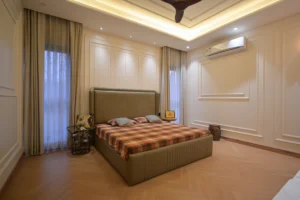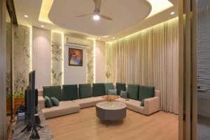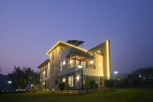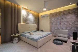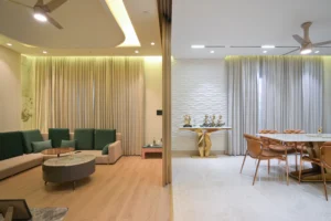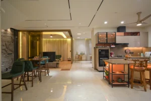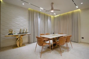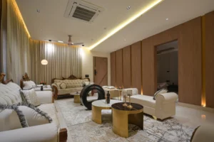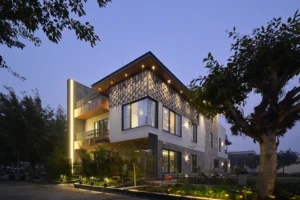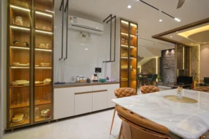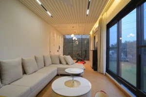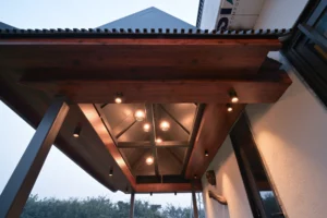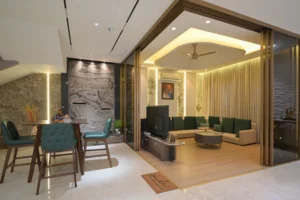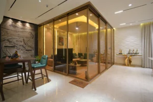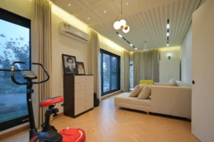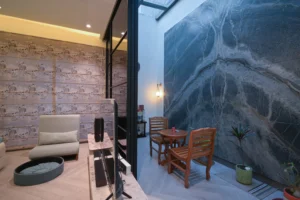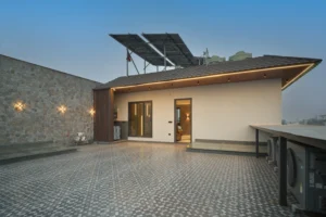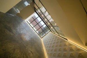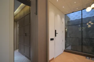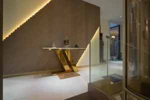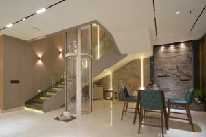 A seamless fusion of modern architecture and Japanese tradition, this project balances innovation with timeless aesthetics. The highlight is a serene Japanese-style gazebo, offering a tranquil retreat amidst the contemporary design. A rich interplay of materials- wood, concrete, glass, and metal- creates dynamic contrasts, while doors as thick as the walls enhance both privacy and acoustics, while effortlessly blending into the walls for a seamless, uninterrupted finish. The striking capsule lift introduces a futuristic element, seamlessly integrating technology into the design. Thoughtful lighting transforms the ambiance throughout the day, accentuating textures and forms. Spaces adapt and evolve, offering a changeable quality that ensures versatility and a continuously shifting experience.